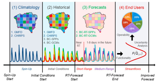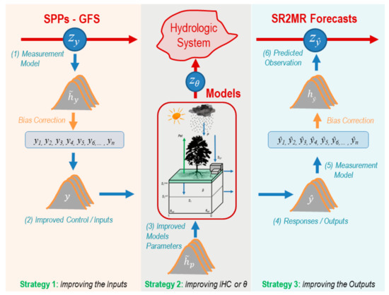 Assuming that an operational HFS can be evaluated as a VEF approach, three main strategies (Figure 8) to establish hydrological processing hypotheses can be applied to evaluate and improve the forecast skill of any hydrological model: (1) Hydrological Pre-processing (HPR) (or Meteorological Postprocessing), which can include the application of bias correction techniques (i.e., physical or statistical improvements) to reduce the propagation of errors or the application of Bayesian or non-Bayesian approaches to estimate an optimal weighted combination of precipitation products; (2) Hydrological Processing (HP), which can include improvements in the models’ structure, states, or parameters; and (3) Hydrological Postprocessing (HPP), which can include bias correction techniques applied over the streamflow forecasts or the use of Bayesian approaches to estimate an optimal weighted combination of streamflow forecasts.