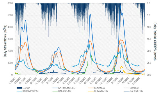 Daily streamflow records for Katima Mulilo, Senanga, Lukulu, Kabompo, Kalabo, Chivata, and Kalene sub-catchments. Daily average rainfall data from CHIRPS are also included. The numbers with “x” next to the names represent an amplification along the y-axis for a better visualization of the hydrographs.