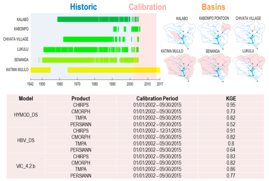 (Top) UZRB and sub-catchments utilized during the daily calibration process. (Bottom) Calibration performances for Katima Mulilo Streamgauge (2002–2015).