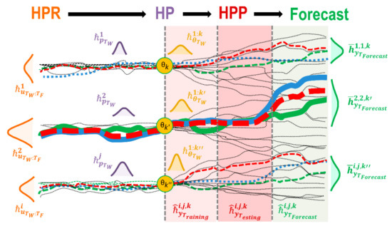 A group of i hydroclimatological inputs, j hydrologic models, and k calibrated model parameters can be used to establish simple or variational ensemble forecasts. A VEF approach can provide a larger number of forecasts than a simple assembling approach, because it evaluates all possible modelling chain sequences that can be arranged to construct an HFS (see Figure 7). At this stage, data assimilation techniques to support the “perfect model assumption” can be also applied to generate deterministic streamflow forecasts. Ref. [46] reviewed and evaluated many available methods to perform deterministic forecasts. However, in an operational context, the experience of streamflow forecasters suggests that uncertainty bands can better support decision making for water management schemes [47,48,49,50,51,52]. The intention of a VEF approach is to use all available weighted or non-weighted components of a modelling chain (HFS) to generate streamflow forecasts. The final hypothesis about the probability distribution of streamflow forecasts can be approximated using several procedures applied to the Multiproduct, Multimodel, and Multiparameter sets, through the implementation of a VEF approach that can be trained during TW and used during TF as: