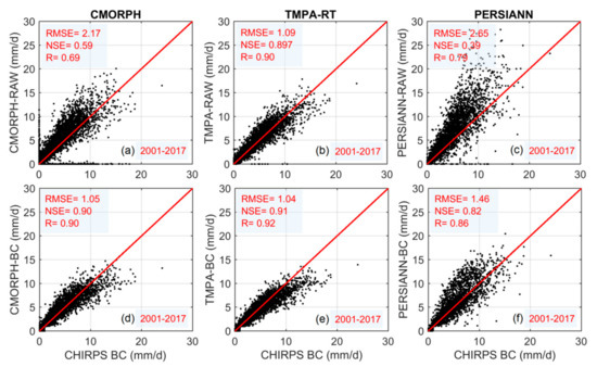 Scatter plots for daily average rainfall in the UZRB. The observed daily rainfall records from CHIRPS (with drizzle effect removed for rainfall ≤ 0.1 mm) are compared to raw (a–c) and corrected (d–f) satellite-based rainfall estimates from CMORPH, TMPA-RT, and PERSIANN for the period 2001–2017. Three error measures are included for comparison: the Root Mean Squared Error (RMSE), the Nash-Sutcliffe Efficiency (NSE), and the Correlation Coefficient (R).