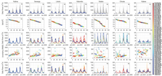 Constraining and selecting the best ensembles for operational forecasting should be understood as a procedure that can vary at any model run. The variation of ensembles depends on the historic forecast skill performance estimated for all available hydrological events and their classified characteristic responses. In the UZRB and its sub-basins, the implementation of an operational VEF approach was used to generate SR2MR streamflow forecasts derived from all possible combinations of SPPs, hydrologic models, and optimal parameter sets (Figure 10a1–a7). The propagation of meteorological uncertainty can be quite large in the resulting streamflow traces when the whole input-model-parameter space is mapped and used for operational forecasts. To avoid unbounded uncertainty bands, the VEF approach allows improving the accuracy of streamflow forecasts through a ranking evaluation and posterior identification of the best hydrologic ensembles for the UZRB (Figure 10b1–b7 for forecasts ranked using skill analysis of R2 and Figure 10d1–d7 for forecasts ranked using total uncertainty defined as RMSE). Then the best ten raw streamflow forecasts are ranked using skill and/or uncertainty measures (Figure 10c1–c7,e7–e7). The application of specific or combined verification techniques on streamflow forecasts usually leads to an improvement of the HPP hypotheses. This multiple evaluation is helpful to identify how skill and uncertainty perform over space and time but also to evaluate how the spatial resolution of precipitation products can have a large effect on the operational forecasts. For instance, the smallest sub-basins inside the UZRB (see Kabombo, Kalabo, Chivata, and Kalene in Figure 10) resulted in higher total uncertainty compared to large basins (see Katima, Senanga, and Lukulu in Figure 10). This reduction in performance in the smallest sub-basins is probably associated with the smallest number of available precipitation grid cells, which produces larger averaged forecasting errors if missing or false detections are present in the forecasts.
