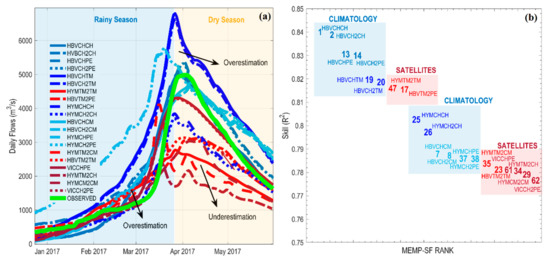 (a) Peak streamflow hydrograph (January to June of 2017) for the UZRB at Katima Mulilo, and (b) Ranked Predictive Skill (R2) for the best 20 simulations obtained from the operational VEF approach. The acronyms represent the Hydrological Models (HYM for Hymod; HBV for HBV; and VIC for VIC); the Satellite Precipitation Products or Climatology (CH for CHIRPS and CH2 for drizzle removed effect; CM for CMORPH and CM2 for its bias corrected version; TM for TMPA and TM2 its bias corrected version; PE for PERSIANN and PE2 its bias corrected version); and the utilized parameter set (CH is CHIRPS parameter set; CM is CMORPH parameter set; TM is TMPA parameter set; and PE is PERSIANN parameter set).