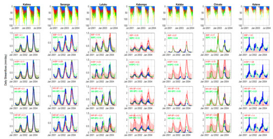 (top) Catchment-average satellite-based precipitation for the UZRB and its sub-basins. SR2MR streamflow forecasts for Katima Mulilo, and its sub-basins Senanga, Lukulu, Kabompo, Kalabo, Chivata, and Kalene (organized from left to right according to their size). The y-axis represents the daily streamflow forecasts, and the x-axis represents the validation and testing periods (2002–2004). The initial streamflow forecasts with their respective uncertainty bands (RMSE in mm) are shown in red. The hydrologically postprocessed (HPP) forecast is shown in light green. BSP is the best streamflow forecast; AVSP is the average streamflow forecast; IVW-SP is the Inverse-Variance Weighting streamflow forecast; IVP-SP is the Inverse-Probability Weighting streamflow forecast. The letter “c” at the end of each acronym represents the regularization applied by combining Multivariate Combinatorial Linear Regression (MCLR) and Inference-Based methods for SR2MR daily streamflow forecasting.