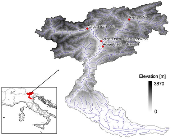 Understanding the hydrological cycle in alpine regions is receiving more and more attention from the scientific community, especially in the context of climatic change, glacial evolution, extreme flood and droughts events, agriculture, and energy production [,,,]. The Alps are identified as the water towers of Europe, being the main source of fresh water for downstream areas, especially in the summer period [,]. Quantifying the drivers and the effects of hydrological extremes on water availability for water management and optimal allocation is an ongoing challenge, especially in snow-dominated environments [,]. The upper Adige River Basin (ARB) (Figure 1) is in the northeast region of the Italian Alps. The ARB has a drainage area of around 12,100 km2 and river length of around 410 km which is the third largest catchment and the second longest river in Italy [,,]. The ARB covers two Italian regions (Trentino Alto-Adige and Veneto) and the upper part (Bolzano Province) accounts for around 62% of the entire catchment area [,,]. The mean annual precipitation is highly variable across the basin [], ranging between around 500 mm (in the northwest region of the basin) up to 1600 mm (in the southern region of the basin). The ARB is an example of a typical Alpine catchment, presenting: (i) strong elevation gradients and steep slopes, which in turn influence the spatial distribution of precipitation [] and (ii) discharges with a minimum in the winter due to the snow accumulation and a maxima in late spring and autumn, due to snow melting and convective storms, respectively [,]. The ARB is one of the most important Italian rivers for: (i) biological and ecological richness, hosting several protected areas such as the Stelvio National Park and a large variety of habitats and natural species [], and (ii) hydroelectric production, providing water for around 34 large hydropower plants with an average nominal capacity larger than 3 MW [,].