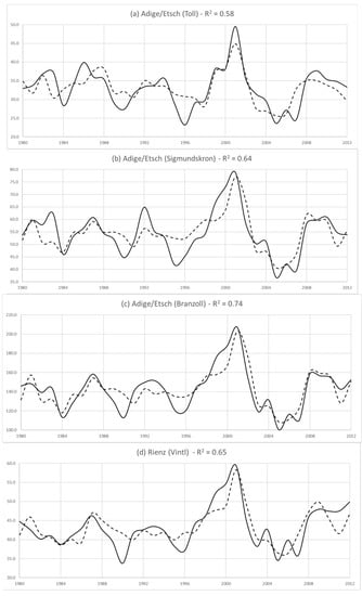 Observed (solid line) and SLR modeled (dashed line) annual flowrate (m3/s) from 1980 to 2012 for (a) Adige/Etsch (Toll), (b) Adige/Etsch (Sigmundskron), (c) Adige/Etsch (Branzoll), and (d) Rienz (Vintl). Coefficient of Determination (R2) is provided.