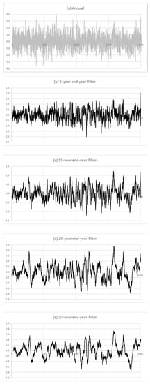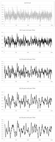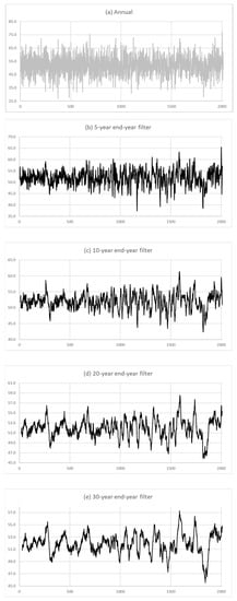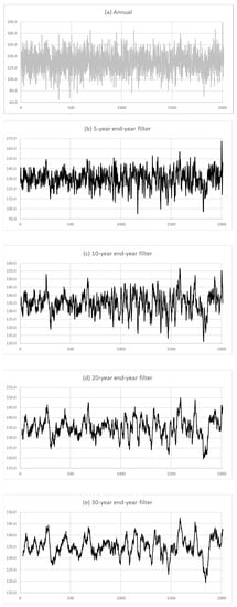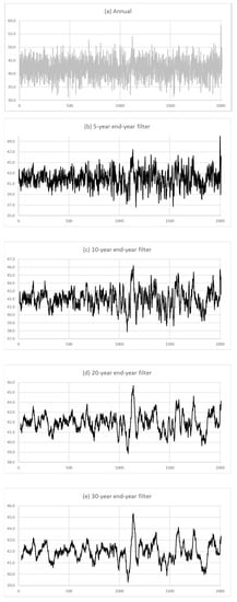 Reconstructed Rienz (Vintl)—Year versus Flowrate (m3/s) from 0 to 2012 AD for (a) Annual, (b) 5-year, (c) 10-year, (d) 20-year and (e) 30-year end-year filters.