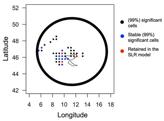 The circular black line represents the 450 km search radius while the Adige River Basin watershed is provided. The three red circles represent scPDSI cells retained in the SLR model; the ten blue circles represent scPDSI stable cells that were not retained in the SLR model; and the twenty-seven black circles represent significant (99%) cells that were not stable.