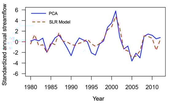 These 13 scPDSI cells were next considered in the SLR regression model and the results provided a statistically strong reconstruction (Table 1). Each of the statistics used to evaluate model skill, multi-collinearity, and over-fitting (e.g., R2 > ~0.50; R2-predicted > ~0.40; VIF < 10 and prefer = ~1.0; Durbin–Watson > ~1.5 and <~2.5; sign test) exceeded established thresholds. Three of the 13 scPDSI cells were retained in the SLR model as identified in the regression equation (Table 1) and Figure 7. As displayed in Figure 8, the SLR model generally captures the variability of the PCA generated regional streamflow vector with the only “misses” being ~1990 and ~1996 when the SLR model over-estimates annual streamflow (Figure 8).