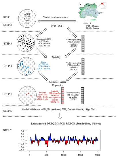 Figure 2—STEP 3). While SVD is an incredibly effective statistical tool for data reduction and identifying significant scPDSI grid points, the PRBQ represents a single vector of annual streamflow variability, accounting for all gauges (either thirteen or six) in the PRB.