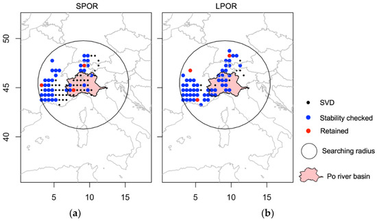 7], the authors selected a search radius of 450 km from the streamflow gauge of interest and considered all LBDA PDSI cells within this radius when developing reconstruction models. In Europe, the Old World Drought Atlas (OWDA) provides annual June–July–August (JJA) self-calibrating Palmer Drought Severity Index (scPDSI) values for 5414 grid points across Europe from 0 to 2012 AD [