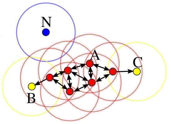 DBSCAN clustering algorithm, shared from [] (CC BY-SA 3.0). N is an outlier, A is a core point, B and C are reachable from A but not core points. The radius of all circles (hyperspheres in an n-dimensional space) is ε.