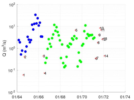 Sakoulevas case study—discharge time series plot. With different colours, the partition of DBSCAN. Period 1 (02/1964–04/1966) with blue dots, period 2 (05/1966–01/1972) with green dots, outliers with red stars.
