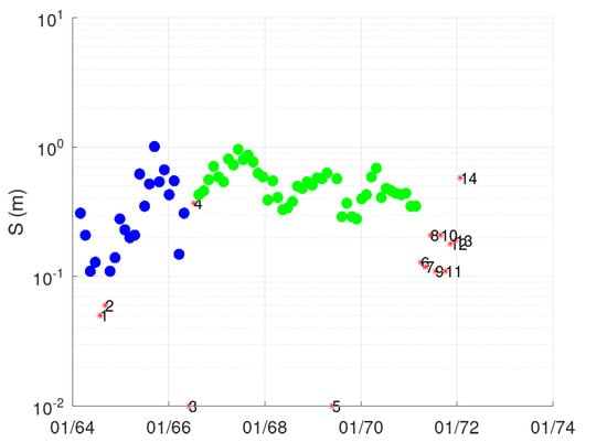 Sakoulevas case study—stage time series plot. With different colours, the partition of DBSCAN. Period 1 (02/1964–04/1966) with blue dots, period 2 (05/1966–01/1972) with green dots, outliers with red stars.