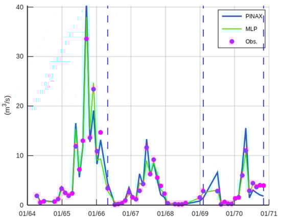 Sakoulevas case study—discharge calculated with the MLP, and discharge calculated with the 3 regression equations after partitioning data with PINAX. PINAX period 1 (02/1964–05/1966), PINAX period 2 (06/1966–05/1969), PINAX period 3 (06/1969–01/1972). The start and end of the periods are marked with the dashed vertical lines.