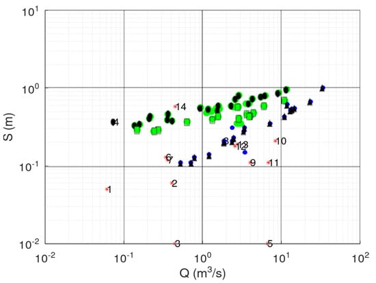 Precipitation measurements can be easily obtained by installing, for example, on a mast, a rain gauge. However, streamflow measurements are not trivial to obtain since they require velocity sampling at multiple locations of a cross-section and the integration of these measurements over the entire cross-sectional area. For this reason, streamflow is measured, most of the time, indirectly via the stage, which is transformed into discharge with a stage–discharge relationship [], usually a power equation [], also known as rating curve. Unfortunately, the stage–discharge relationship can vary with time, in response to degradation, aggradation, or a change in the channel shape at the control section []. This results in a shift in the measurements arriving after each cross-section change (different discharge for the same stage). As a consequence, the stage–discharge measurements tend to cluster into groups that correspond to different hydraulic behaviours of the cross-section.