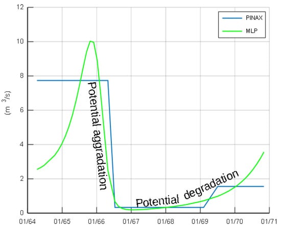 An intriguing use of the MLP comes when a steady stage is used as input (for example, the mean stage of the available measurements). In this case, the MLP returns the discharge of the cross-section for the same stage over different time instances of the assessed period. This is actually a schematic representation of how the cross-section change is perceived by the trained MLP. Figure 8 displays the discharge calculated by the MLP and the PINAX-obtained regressions for a constant stage equal to the mean stage. According to this figure, the two approaches present a similar schematisation of the cross-section change.