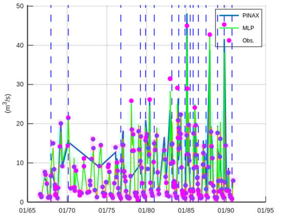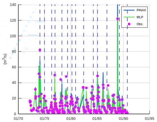 Agrafiotis case study—discharge calculated with the MLP and discharge calculated with the 16 PINAX-obtained regressions. The start and end of these 16 periods are marked with the dashed vertical lines.