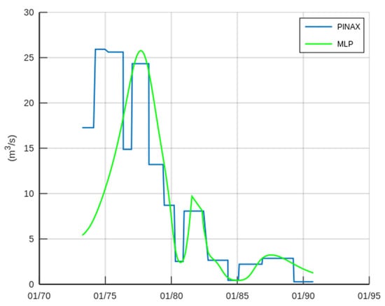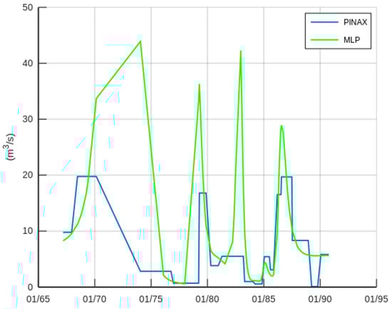 Table 1 displays the statistical tests employed in the PINAX application []. Only the four first tests of the six mentioned in Section 2.1 were used. PINAX does not offer solutions that fail, even in a single test. The MLP fails at the second test despite having a better DC (0.97 instead of the overall 0.93 of PINAX). This is happening because, according to the second test design, the departures are divided by the standard deviation of residuals, which is much lower in the MLP than in PINAX (0.26 instead of 0.4 m3/s). The scope of this test in PINAX was mainly to detect outliers and it does not have a significant impact on the overall performance of the method.