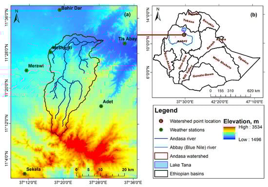 Location map of the study area (a) Andasa watershed with the location of weather stations and (b) Ethiopian basins and the point location of Andasa watershed. The background in the Andasa watershed is the elevation in meters.