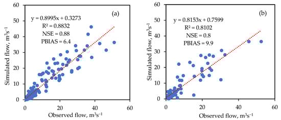 Scatter plot of observed versus simulated streamflow during (a) calibration and (b) validation periods. R2 is the coefficient of determination; NSE is the Nash–Sutcliffe efficiency, and PBIAS is the percent of bias.