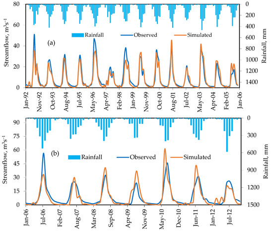 Observed and simulated streamflow with rainfall during (a) calibration and (b) validation periods.