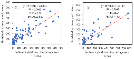 Scatter plot of sediment yield from the rating curve versus simulated streamflow during (a) calibration and (b) validation periods. R2 is the coefficient of determination, NSE is the Nash–Sutcliffe efficiency, PBIAS is the percent of bias, and Ktones stands for thousands of tons.