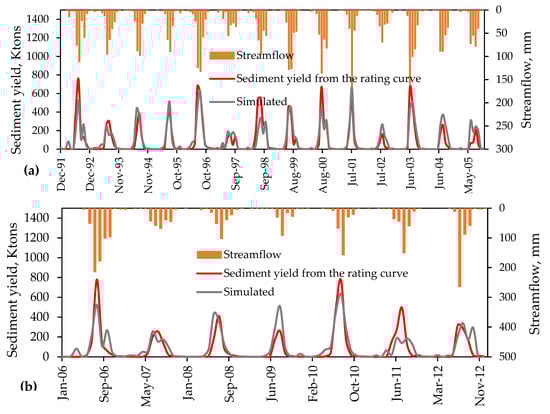 Observed and simulated sediment yield with runoff during (a) calibration and (b) validation and periods. Ktones stands for thousands of tons.
