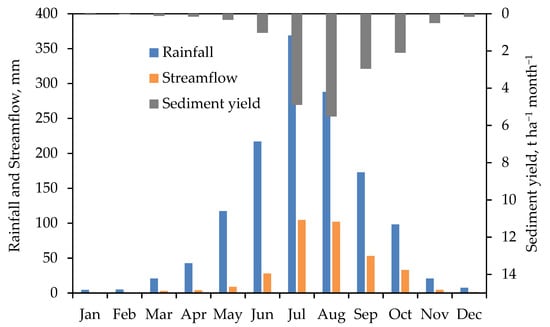 Mean monthly rainfall, streamflow, and sediment yield of the Andasa watershed between 1990 and 2020.