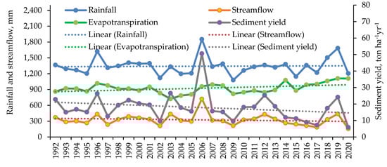 Annual rainfall, evapotranspiration, streamflow, sediment yield, and the corresponding trend lines for the entire simulation period.