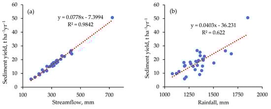 Correlation of (a) annual streamflow and sediment yield and (b) annual rainfall and sediment yield.