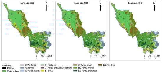 2 (LU 2016). For the studied periods, the most dominant land use types were agriculture (>28%), followed by forest mixed (>27%) and pine tree plantations (>9%). Between the years 1997 and 2016, the most important increase took place with mixed forests and pine tree plantations, with values that range between 2.67% (37.0 km