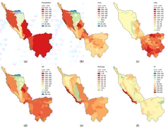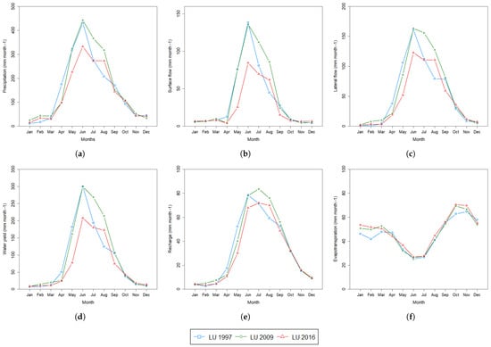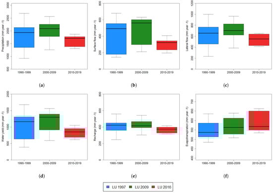 Table 9), variation in precipitation values has been simulated during the three decades of study, particularly a major reduction was estimated in the last decade. In the decade of 2000–2009, an increase in PRECIP has been obtained in comparison to LU 1997; specifically, an accumulated yearly average value of 2010.2 mm is the maximum value for all the studied periods. Similarly, maximum values of SURQ, LATQ, WY, and RCHRG were obtained during the period with LU 2009.