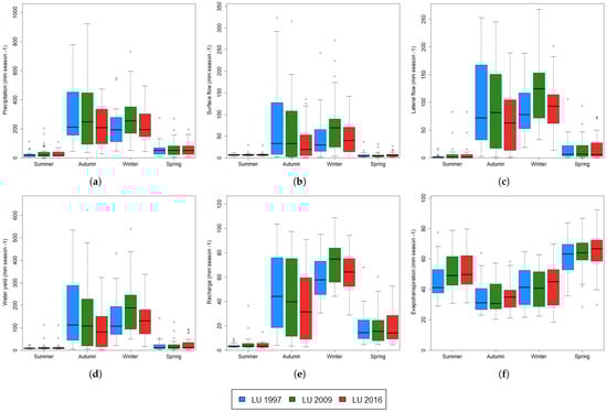 Variations of PRECIP in the autumn and winter periods were achieved over the decades of study. Particularly, the variations increased in the amount of rainfall from 2000 to 2009 and decreased from 2010 to 2019. In the case of SURQ, a constant reduction was estimated during the study period. In particular with LU 2016, a strong reduction of surface flow during the autumn season (April–June) was estimated. In addition with a reduction during the last 10 years in comparison with LU 2009. Similar results were obtained for LATQ with a decrease during the last decade under LU 2016. In consequence, reductions on the resulting WY during autumn and winter seasons with LU 2016, in comparison with LU 1997 and 2009. Similarly, groundwater recharge (RCHRG) shows a tendency to reduce the amount during the autumn season. In the case of ET, summer values are higher under LU 2009 and 2016. During the winter and spring seasons, a partial increase under LU 2016 was simulated.