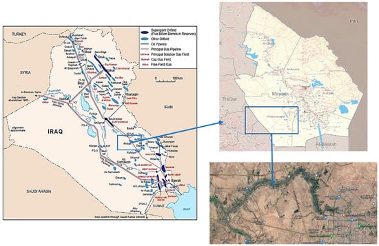 Amarah is the capital of the Maysan Governorate in southern Iraq (Figure 1). The study area is defined by longitudes (46°20′–48°05′ E) and latitudes (31°10′–32°50′ N), located 400 km south-east of Baghdad Province. Additionally, the area of Maysan Governorate covers around 16,683 km2 []. Amara has a characteristic climate with hot summers and chilly winters. In the summer, high temperatures are frequently over 40 °C. Precipitation falls during winter and averages 177 mm annually [].