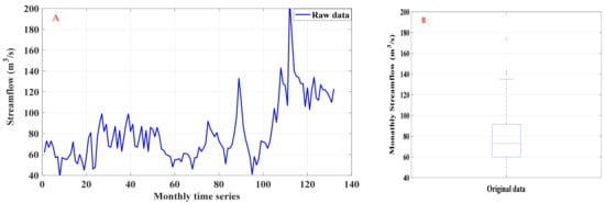 (A) Monthly streamflow time series; (B) box plot for the Tigris River streamflow at Amarah City.
