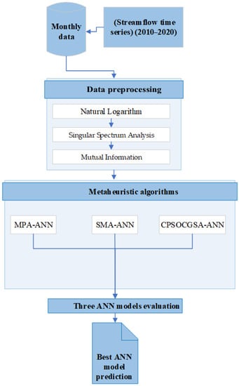 Therefore, forecasting is considered essential for water conservation and ensuring environmental sustainability, as has been proven in various fields [,]. Forecasting streamflow over time is critical for a variety of reasons, including water supply reliability, drought and flood risk, and environmental maintenance security. Long-term accurate streamflow forecasts help with water resource planning and management []. On the other hand, river flow modelling is a complex undertaking, as river flow time series are frequently random, dynamic, non-linear, and chaotic []. An analysis of the univariate streamflow predictions by Zhang et al. [] found that data-driven models are widely used because of their simplicity and minimal data needs. The most frequently artificial intelligence (AI) models used in streamflow forecasting are neural-based fuzzy inference systems (ANFIS) [], support vector machines (SVM) [], and artificial neural networks (ANN) []. As a simple operational model, ANN offers significant non-linear mapping capabilities []. Despite the many successes that have resulted from employing the ANN method with a single ANN, there is still a lot of space for development []. This has encouraged researchers to improve their models. However, various hybrid models incorporating ANNs and various optimization strategies have been created [].