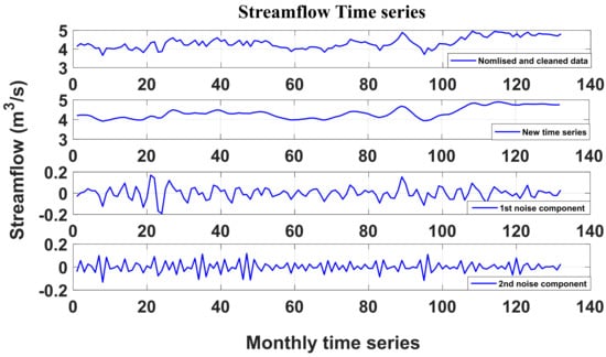In the same context, the literature has emphasized the importance of applying data pre-processing to enhance time series quality and identify the best predictor scenarios. The importance of data cleaning has grown in recent years. Consequently, several signal pre-treatment strategies have been used to eliminate noise in streamflow time series, such as wavelet transform (WT) [], singular spectrum analysis (SSA) [], empirical mode decomposition (EMD) [], and variational mode decomposition (VMD) []. Another substantial aspect of data pre-processing is choosing the best scenario for predictors, such as mutual information (MI) [], for a univariate model. Using non-linear statistical dependence metrics, such as MI, is more suitable for selecting inputs for ANN techniques than a correlation, which has the limitation of only assessing the linear relationship between variables [].