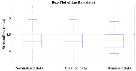 Three box plot shapes for normalized, cleaned, and denoised streamflow time series are shown in Figure 5. The figure reveals that the normalized time series had two outliers, and there was no significant difference in the shape of the data compared with the cleaned form. All of the shapes had nearly the same median and upper and lower quartiles, while the upper and lower whiskers of the denoised time series shape were less than those of the other two shapes (normalized and cleaned time series).