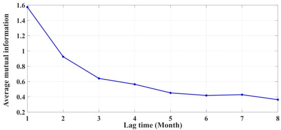 Selecting a suitable predictor’s scenario is one of the most crucial steps for developing the structure of the prediction model. This phase improves the model’s performance by identifying the most significant factors []. In order to choose the most effective explanatory variables, the mutual information (MI) technique was applied in this study. Danandeh Mehr et al. [] stated that the average mutual information (AMI) is a non-linear generalization of the autocorrelation function. Mutual information is commonly utilized to locate time-delayed independent variables.