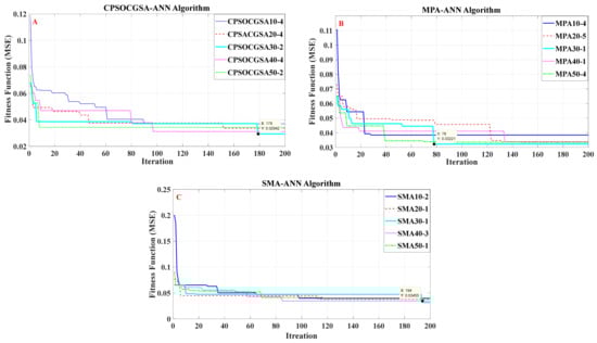 Figure 7A displays that the (30_2) swarm size gave the best solution for the CPSOCGSA-ANN algorithm (MSE = 0.02942, after 179 iterations) for streamflow, while in Figure 7B, the (30_1) swarm size provided the optimal solution for the MPA-ANN algorithm (MSE = 0.03221, after 78 iterations). Figure 7C presents the swarm size (30_1) and offered the best solution for the SMA-ANN algorithm (MSE = 0.03455, after 194 iterations).