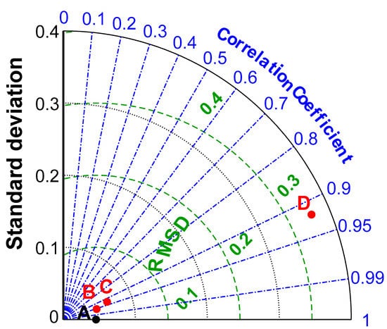Additionally, Figure 8 shows the Taylor diagram for the CPSOCGSA-ANN (B), MPA-ANN (C), and SMA-ANN (D) forecast techniques in the validation stage. This diagram proposes a graphical summary of the agreement between the observed and predicted patterns based on the standard deviation (SD), root-mean-square difference (RMSD), and correlation coefficient (R). In Figure 8, the grey arc, blue azimuthal line, and green contour line refer to values for the SD, R, and RMSD for the observed (reference point, A) pattern, respectively. The diagram reveals that the CPSOCGSA-ANN technique produced low SD, RMSD, and high R, and was the nearest model to the reference point, representing the observed pattern.