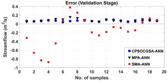 In order to scrutinize the goodness of fit of the three techniques, an error analysis was achieved in the validation stage. The error scatter plots against the sample numbers for the validation stage are presented in Figure 9. What stands out in this figure is that the mean error of the CPSOCGSA-ANN model was closer to zero (from 0.041 to 0.097) than the other techniques, and SMA-ANN was the worst (from −0.874 to 0.375). There was no definite pattern to the distribution. The above outcomes affirmed that the proposed methodology (CPSOCGSA-ANN) offered a more accurate performance than the MPA-ANN and SMA-ANN models.