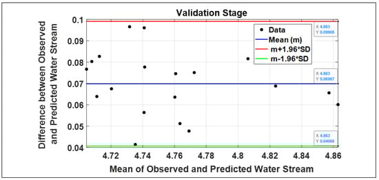 In addition, a Bland–Altman scatter plot was used to scrutinize the agreement of the CPSOCGSA-ANN model. The plot can show the systematic and random differences and the merit of revealing the variation in the results. Figure 10 shows scattered data, suggesting an excellent distribution fit between limits of agreement (100%). Moreover, a further statistical test revealed that the CPSOCGSA-ANN model yielded SI of 0.015, which indicates an excellent outcome. Taken together, these results indicate the relation between the measured and simulated values.