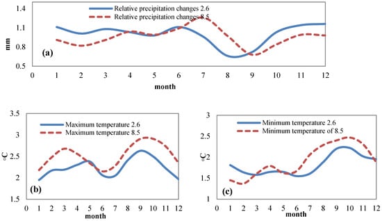 In this study, under the two scenarios of RCP2.6 and RCP8.5, related to the 5th Assessment report on climate change provided by the intergovernmental panel on climate change, the output of the HADGEM2 model was used. These data are freely accessible through a center for data distribution established by the IPCC in 1998. (www.TPCC-data.com, accessed on 21 January 2022). In order to see the data on the area under study within the basic and future periods of 20 years, the spatial coordinates of the given location and the required statistical length, the time series of temperature and precipitation during the basic period (1986–2005) and the future period (2020–2039), should be input in order to have access to the monthly output of the parameters within these two periods. Once the downscaling of the temperature and precipitation data in the LARS-WG model is completed, the climatic results were analyzed. Figure 1 shows the comparison of the relative changes in precipitation, the maximum and minimum temperature under RCP8.5 and RCP2.6 scenarios within the base period.