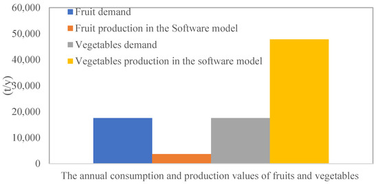 Figure 5. The annual consumption and production values of fruits and vegetables in the urban model of Borujerd for a population of 240,654.