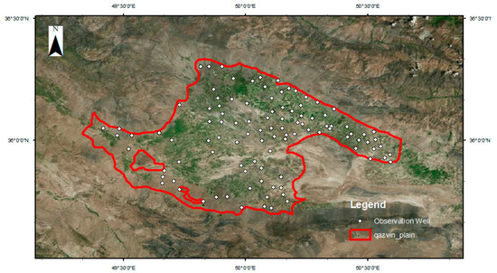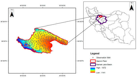 The Qazvin Plain, located within the 49°20′–50°34′ E and 35°38′–36°21′ N coordinates in north-central Iran, is a fertile plain at the southern foothills of the Alborz. The plain (Figure 1) is known as the largest aquifer in Namak Lake Basin, with an area of 4737 km2 and an annual precipitation average of 256.6 mm [32,33]. About five percent of the country’s agricultural products are irrigated over this plain and 89% of the groundwater storage in these plain harvests is needed for agricultural uses. The bedrock depth of the unconfined aquifer of the Qazvin Plain varies between 70 and 370 m. Its shallower depth is located at the eastern part, whereas the deepest part is somewhere near the center of the plain [34].