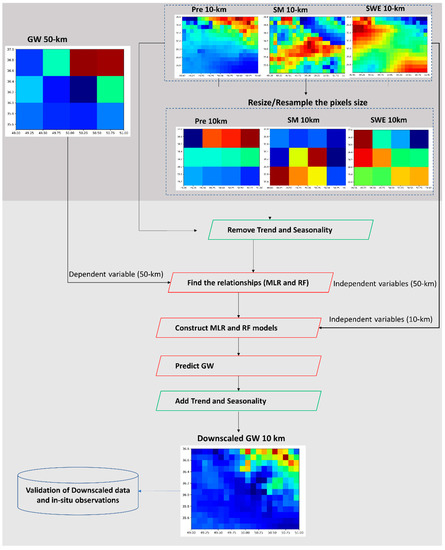 The method adopted in this study assumes that the statistical relationship between the predictor variables and the GWSA at a coarse resolution is maintained at a finer resolution. The statistical relationships between original coarse GWSA and predictors were extracted via models. Input data were randomly partitioned as follows: 80% for training and 20% for validation.