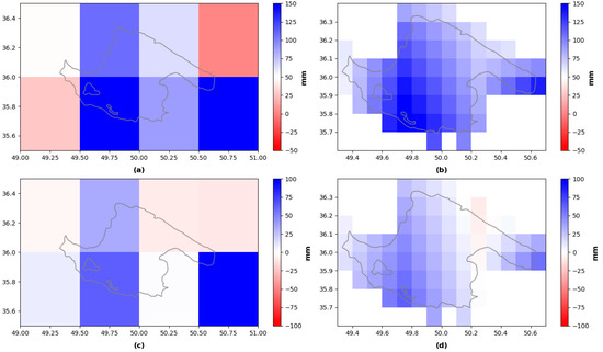 Spatial distribution of GWSA before and after the downscaling; (a,c) the original 0.5-degree WGHM-GWS data on April 2010 and August 2010; (b,d) the downscaled product at 0.1 degrees in the same month.
