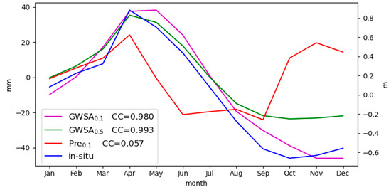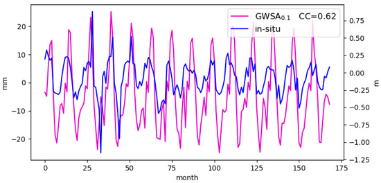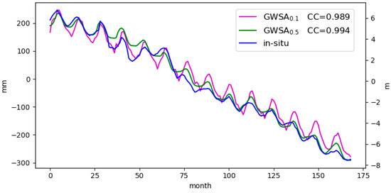 As already noted, the in situ groundwater level observation has not been converted to groundwater storage. Therefore, Figure 5 has two axes; the left one with the unit of mm corresponds to the GWSA, while the right vertical axis is associated with the in situ GWL anomaly with a unit of m.